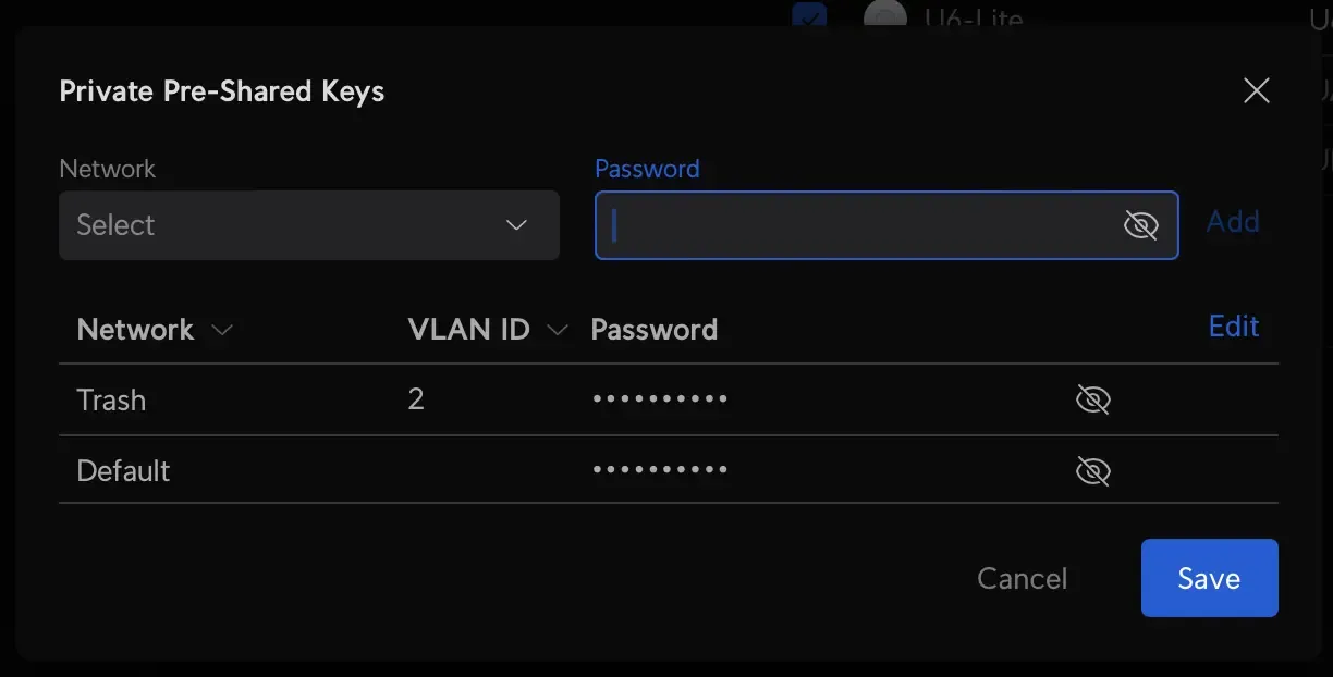 Ubiquity has rolled out support for PPSK (Private Pre Shared Keys). That let’s you have multiple networks, behind one SSID. This is handy, as having too many SSIDs can hurt performance.