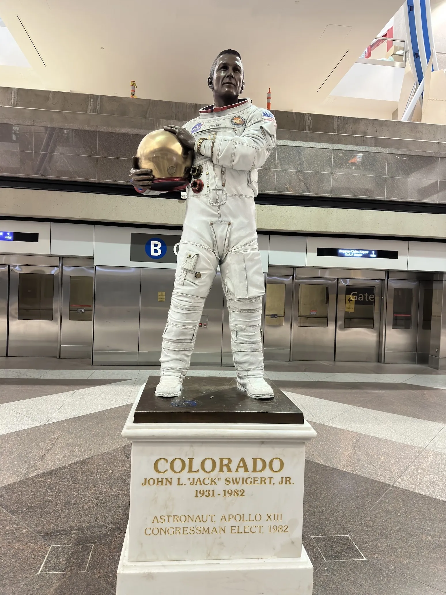 Taking your time will also let you see more of the airport. A lot of the large airports have a lot off cool things to look at. Be it cool art, cool planes, and cool architecture. My favorite airport find, is this statue of Jack Swigert, pilot of Apollo XIII.
