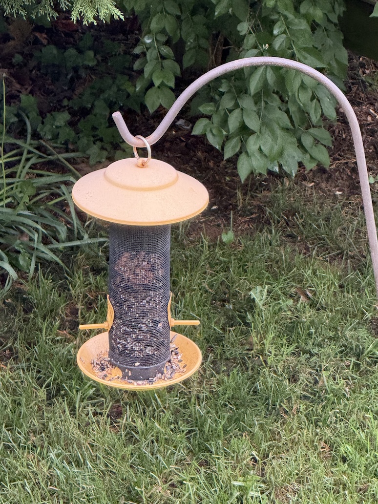 I’ve already seen a couple birds on the tube feeder. Though, they flew off when I brought out the big camera. It’ll take them a while to get comfortable. Didn’t take the squirrels long though.
