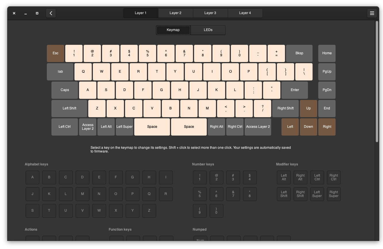 You can change a fair amount here. Key mappings, layers (up to four), and the RGB LEDs. You can even have different RGB settings per layer. Everything is saved to the keyboard, so it’s pretty set and forget.